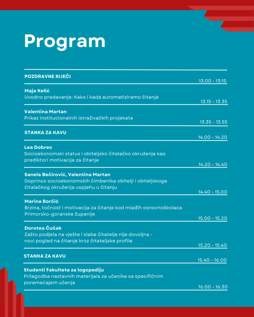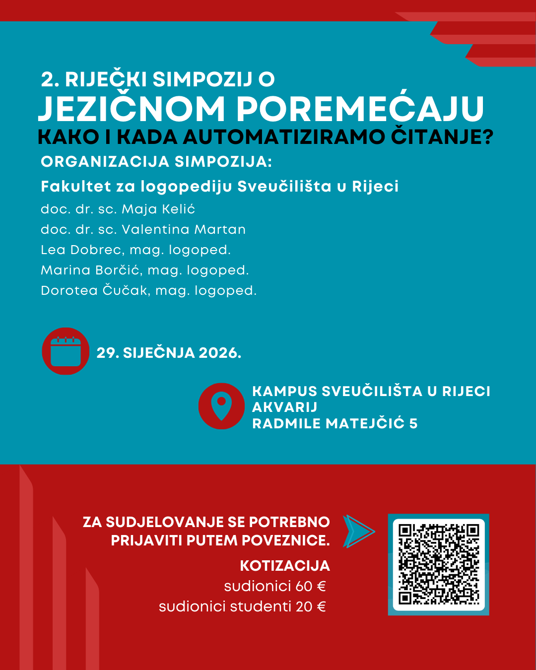 Fakultet za logopediju Sveučilišta u Rijeci organizira 2. riječki simpozij o jezičnom poremećaju pod nazivom „Kako i kada automatiziramo čitanje?“ koji će se održati u četvrtak, 29. siječnja 2026. u Rijeci, u Akvariju na Kampusu Sveučilišta u Rijeci s početkom u 13 sati.