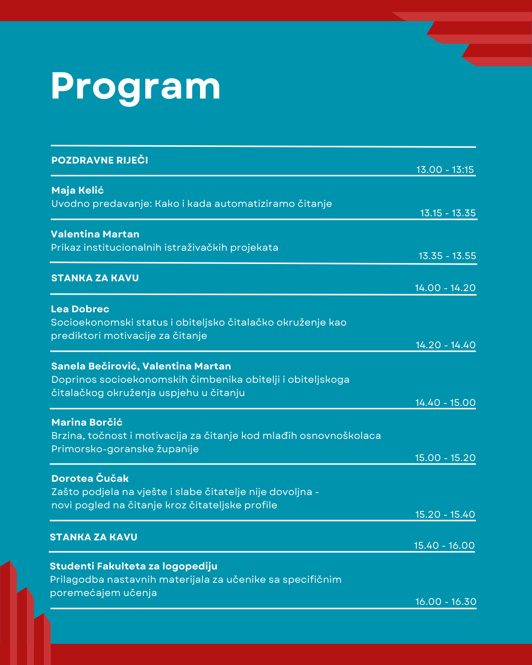 Program uključuje predavanja djelatnika i studenata Fakulteta za logopediju, a cilj mu je prikazati rezultate dosadašnjih istraživanja provedenih u sklopu institucionalnih istraživačkih projekata:Istraživanje preduvjeta za razvoj automatiziranog probira vještine čitanja učenika trećeg i četvrtog razreda: standardizacija materijala namijenjenog probiru učenika za teškoće čitanja i Socio-ekonomski čimbenici i obiteljsko čitalačko okruženje kao odrednice uspjeha u čitanju učenika 3. i 4. razreda osnovne škole. Na simpoziju će se također predstaviti planovi za buduća istraživanja. Simpozij će završiti izlaganjima naših studenata koji će predstaviti svoje radove o prilagodbi nastavnih materijala za učenike sa specifičnim teškoćama učenja.
