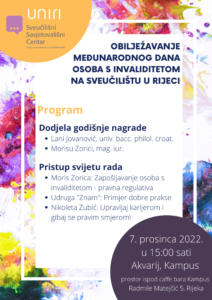 Ured za studente s invaliditetom Sveučilišnog savjetovališnog centra, povodom Međunarodnog dana osoba s invaliditetom koji se obilježava 3. prosinca, organizira svoju tradicionalnu dodjelu nagrade najuspješnijem studentu i najuspješnijoj studentici s invaliditetom na Sveučilištu u Rijeci za proteklu akademsku godinu, uz prigodan program.