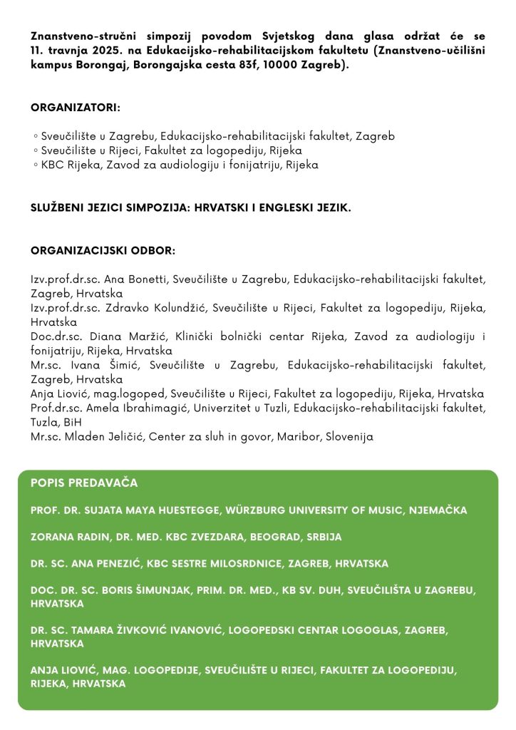Znanstveno-stručni simpozij povodom Svjetskog dana glasa, održat će se 11. travnja 2025. na Edukacijsko-rehabilitacijskom fakultetu (Znanstveno-učilišni kampus Borongaj, Borongajska cesta 83f, 10000 Zagreb)