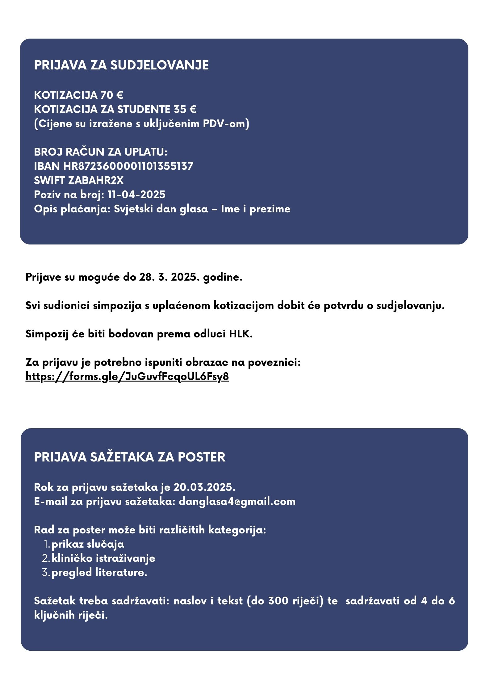 Znanstveno-stručni simpozij povodom Svjetskog dana glasa, održat će se 11. travnja 2025. na Edukacijsko-rehabilitacijskom fakultetu (Znanstveno-učilišni kampus Borongaj, Borongajska cesta 83f, 10000 Zagreb)