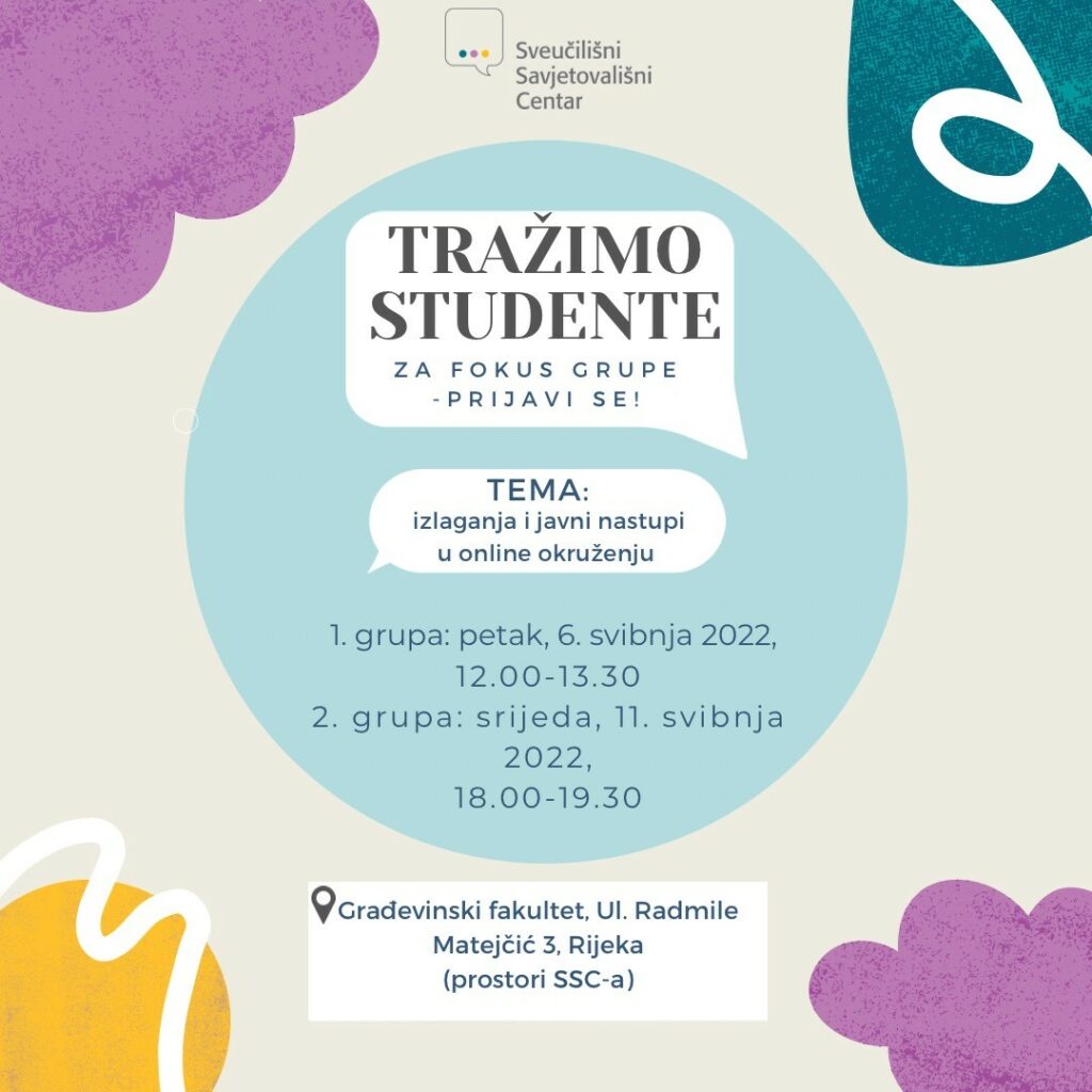 Psihološko savjetovalište Sveučilišnog savjetovališnog centra (SSC-a) poziva studentice i studente riječkog Sveučilišta na sudjelovanje u fokus grupama o izlaganjima i javnim nastupima u online okruženju. Pandemija korona virusa preselila je brojne aktivnosti u online okruženje, tražeći od nas naglu prilagodbu novim uvjetima. Djelatnice Psihološkog savjetovališta SSC-a odlučile su se pozabaviti temom izlaganja i javnih nastupa […]