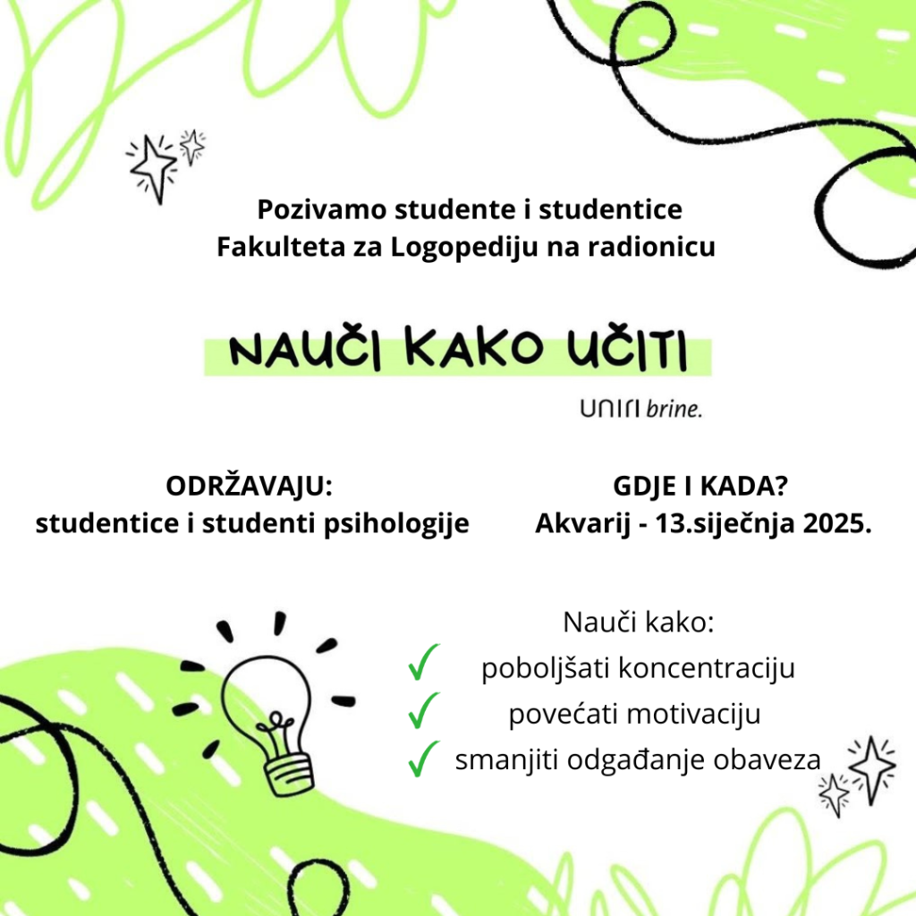 Dragi studenti i studentice logopedije, pozivamo vas na radionicu o učenju koju će za vas održati studentice i studenti psihologije! Radionice traju 90 minuta, a na njima ćete naučiti strategije učenja, kako poboljšati koncentraciju, povećati motivaciju i kako smanjiti odgađanje u izvršavanju obaveza. Dođite i upoznajte starije kolege i kolegice, razmijenite svoja iskustva učenja te se nastavite susretati kao […]