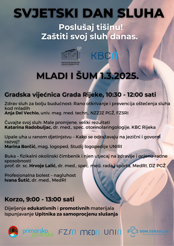 Povodom obilježavanja Svjetskog dana sluha održat će se edukativni program predavanja na temu “Mladi i šum”, u organizaciji Zavoda za audiologiju i fonijatriju Kliničkog bolničkog centra Rijeka i Nastavnog zavoda za javno zdravstvo Primorsko-goranske županije. U subotu, 1. ožujka 2025. godine održat će se javnozdravstvena akcija i edukativna predavanja povodom obilježavanja Svjetskog dana sluha. Događanje […]