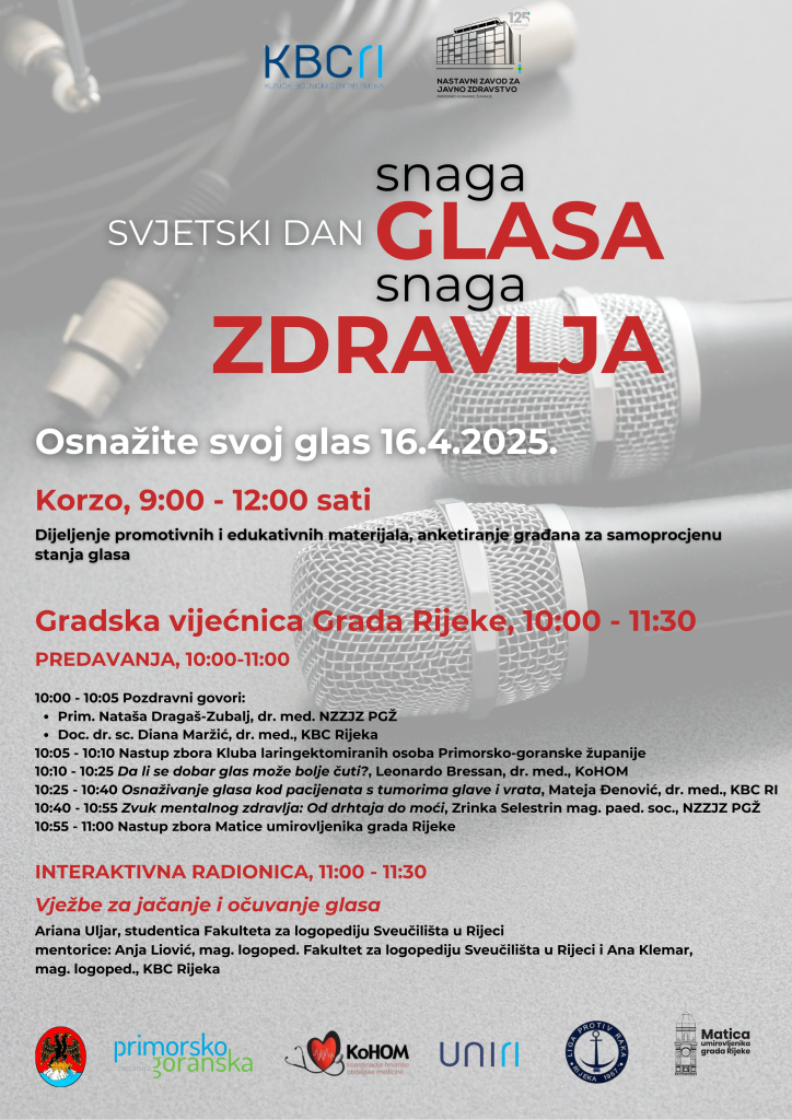 Povodom Svjetskog dana glasa, u srijedu 16. travnja 2025., u organizaciji Nastavnog zavoda za javno zdravstvo Primorsko-goranske županije i Zavoda za audiologiju i fonijatriju Kliničkog bolničkog centra Rijeka, održat će se javnozdravstvena akcija i stručno-edukativni program. Javnozdravstvena akcija na Korzu (9:00 – 12:00) Građani će imati priliku ispuniti Upitnik za samoprocjenu stanja glasa i pritom […]